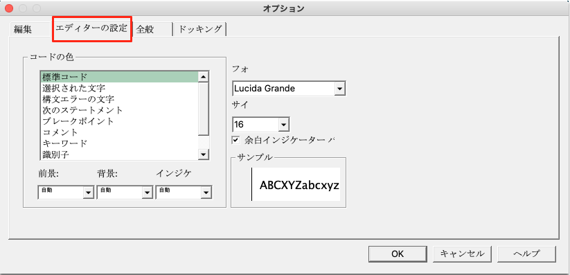 特に「標準コード」「コメント」「キーワード」などは、色とフォントの設定が密接に関わっているため、確認を忘れないようにしてください。